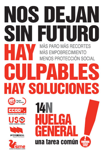 El 14 de Noviembre voy a secundar la convocatoria de Huelga General. Siempre he creído en la lucha social y en la lucha por lo que, a mi modo de ver, es justo.Entiendo, por supuesto, gente que no se quiera adherir a la convocatoria, pero sólo aquella que considere que lo que estamos sufriendo es lo correcto, que las medidas que nos están infringiendo son las más adecuadas para superar la Depresión. No entiendo a los cobardes que justifican su no participación en excusas. O estás de acuerdo o no, y ya, es así de simple.