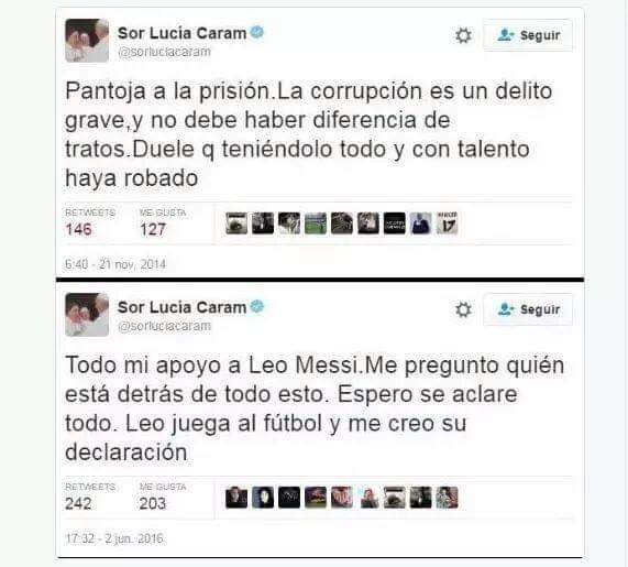 He de confesarle señora Caram que jamás he confiado en aquellos que sólo se quejan. O qué pretenden lanzar una piedra pero se la dejan a los demás para que ellos se ensucien. Quizás por salir vestida de hábito para soltar una serie de obviedades que si suenan bien no aportan nada al debate, siempre me he preguntado cuál podía ser su papel. Si no fuera vestida como va nadie le habría hecho caso, pero como producto vende bien: «monja, argentina, culé e independentista» y «azote de los políticos corruptos». La gente piensa que ojalá toda la Iglesia fuese igual. Pero les digo a esa gente que no se olviden que la Iglesia no paga impuestos, recibe dinero que no declara y por si fuera poco el Estado la financia a través de nuestros impuestos (no me diréis que como empresa pública no es de lujo).